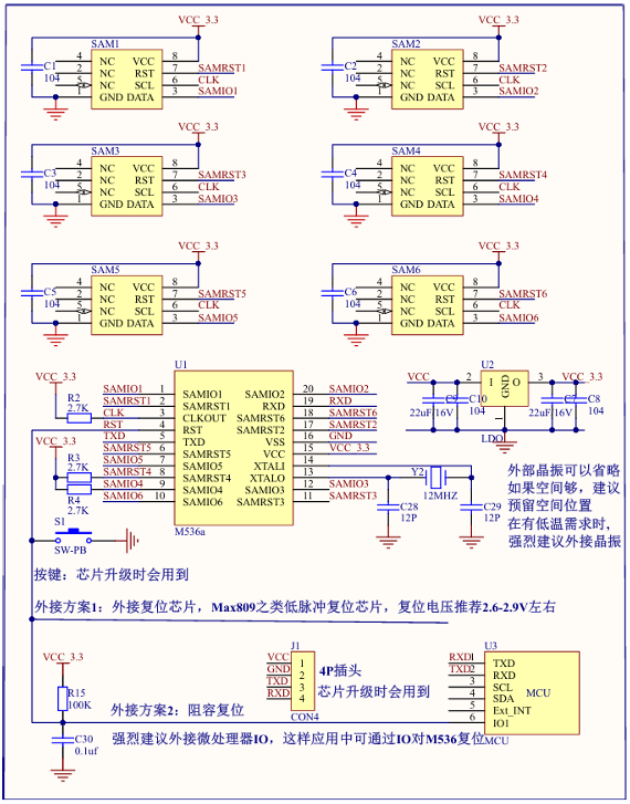 M536a | UART接口 支持6個SAM卡 | SAM9600,SAM38400,SAM115200, ISO7816-4 CPU卡 T=0/T=1卡片 |